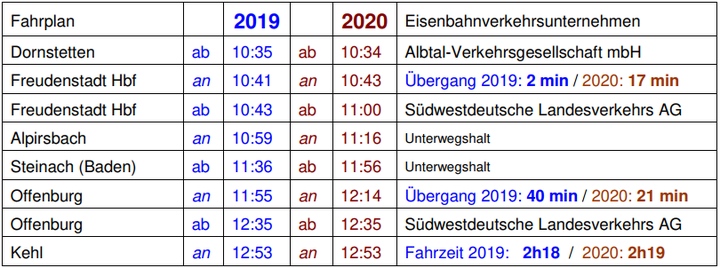 Eine allgemeine Aussage kann dazu gibt es nicht, denn es sind eine große Vielzahl von Relationen zu betrachten. Allein in Offenburg gibt es 146 Übergangs-Relationen. Nehmen wir mal als Beispiel die Fahrt an einem Werktag von Dornstetten (dem "Auslöser" der Fahrplanänderungen) nach Kehl und vergleichen die Fahrpläne 2019 und 2020 miteinander. Das Fahrplanjahr 2020 beginnt am 15.12.2019 und endet am 12.12.2020, ein "kleiner" Fahrplanwechsel findet am 14.06.2020 statt.